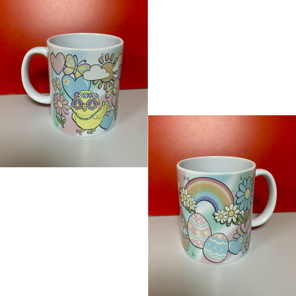 This item is the pastel easter design mug. The image shows both sides of the mug illustrating hearts, butterflies, chick, rainbow and eggs